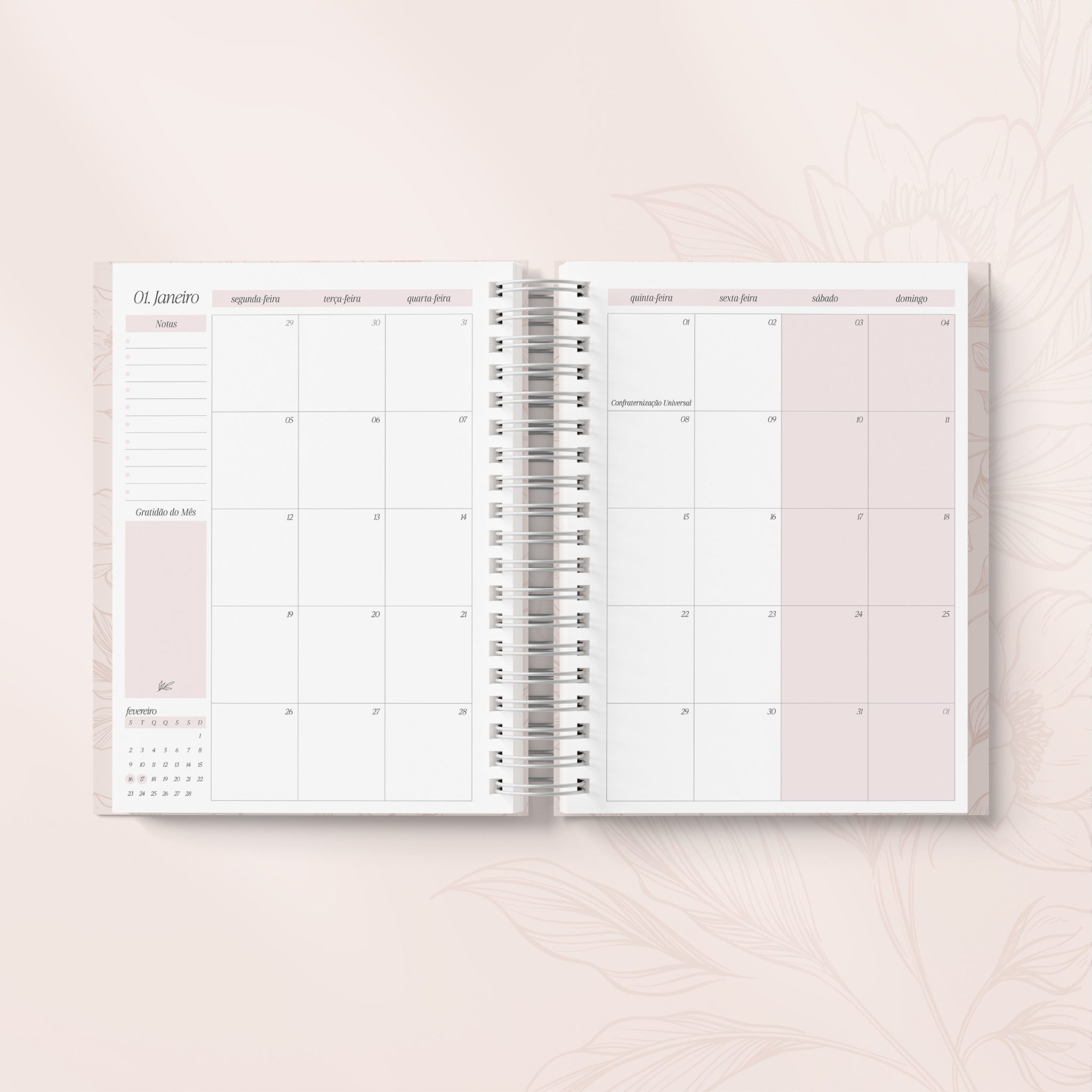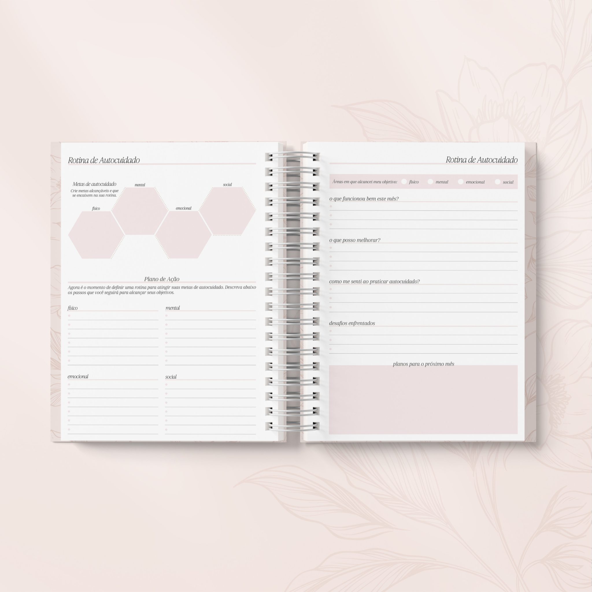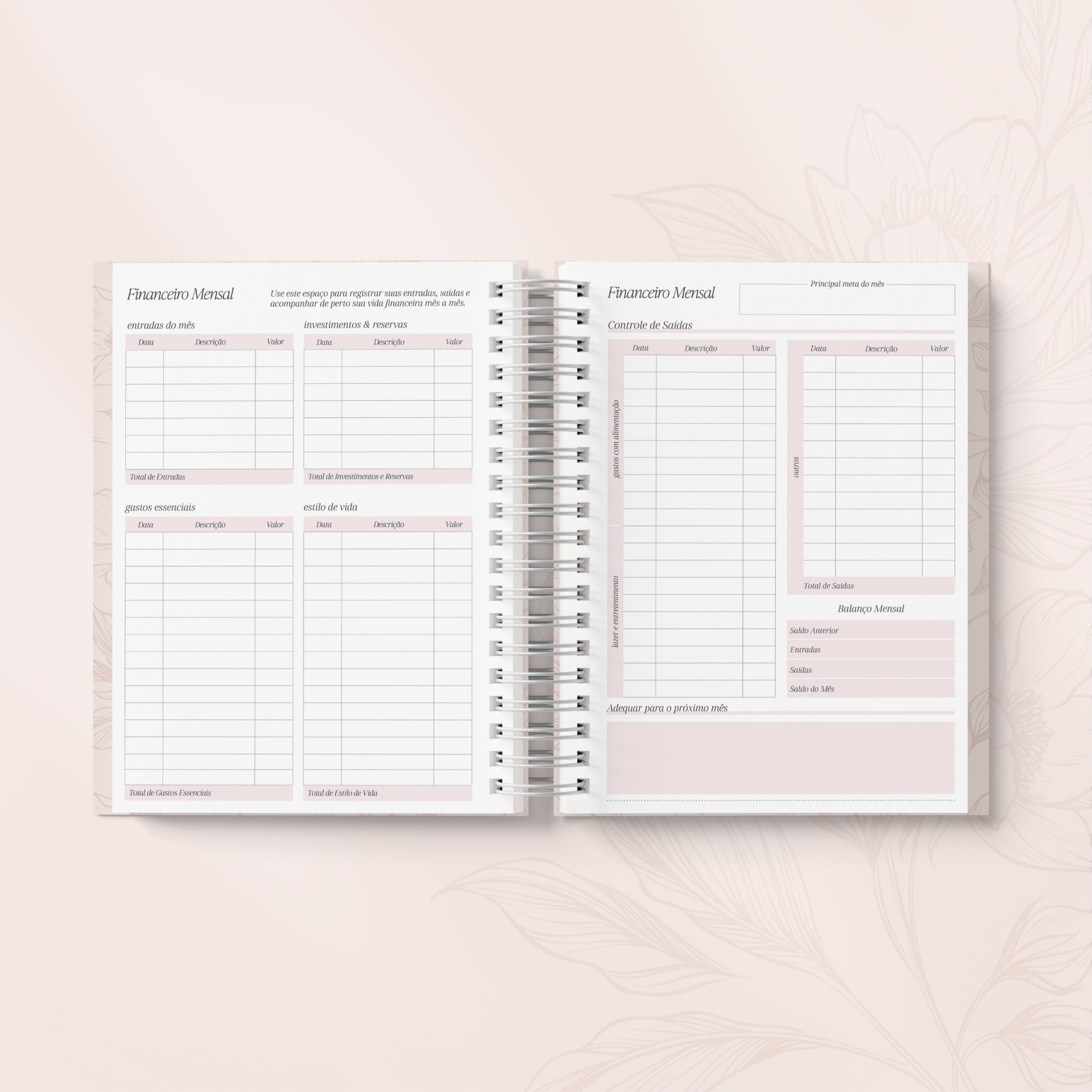 Abertura do mês com mini calendário, espaço de priorizações, planejamento financeiro mensal, autocuidado e análise do mês — tudo pra te ajudar a equilibrar tarefas e bem-estar com leveza.